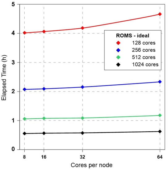Cho et al. (2017) found that the performance of parallel MPI with the same nodes was improved by up to 272% when using on-package memory (Multi-Channel DRAM, MCDRAM), which is one of the features of the KNL system []. Butcher et al. (2018) studied optimization methods for data types that are not suitable for MCDRAM on a KNL system []. Rho et al. (2017) discussed a solution for performance bottlenecks that can occur when running MPI applications on a KNL system [], and Yoon and Song (2019) analyzed the features of manycore architectures such as the KNL system []. However, these studies were not conducted using general numerical models used in real circumstances and did not include the effects of inputs and outputs.