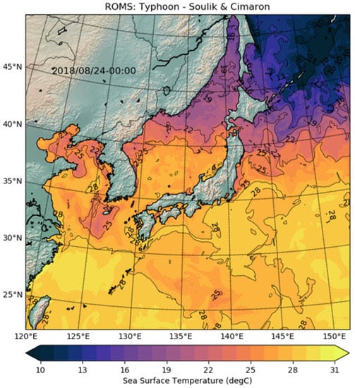 GFS data and HYbrid Coordinate Ocean Model (HYCOM, https://ncss.hycom.org/thredds/ncss) data were used for the initial field and external forces. The experiment was simulated for 24 h from 0:00 to 24:00 on 23 August 2018. This is the period when the twin typhoons of Soulik and Cimaron severely damaged the Korean Peninsula and represents an appropriate integration time required for performance analysis. GFS data for surface wind, heat flux, freshwater flux, surface air pressure, cloud, albedo and so on were used for the surface external forces required by ROMS. HYCOM data was also used for an initial field and lateral forces of the U, V, SSH, T, and S were interpolated to fit the ultra-high resolution model grid.