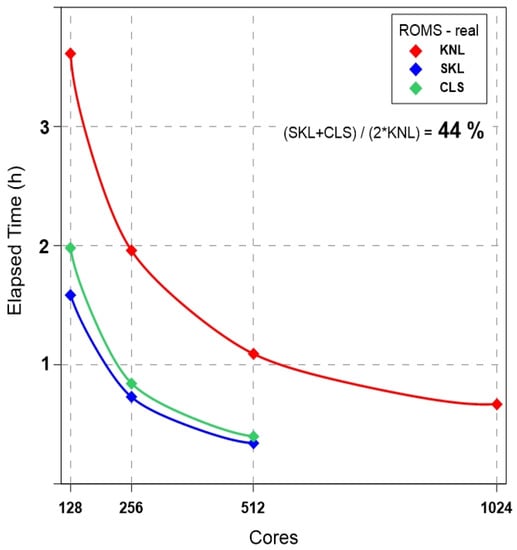 Performances of the benchmark experiment by the number of cores using ROMS: (SKL+CLS)/(2*KNL) = 47%.