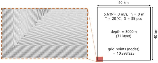 An ideal ultra-high resolution grid for the FVCOM-Benchmark experiment was constructed with approximately 10 million grid points (nodes = 10,398,925). The right image in Figure 15 shows the detailed experimental configuration. The interval of every grid node (= point) is about 10 m for the integration efficiency and stability of the simulation. The internal angles of the triangle grid elements were set close to the angles of an equilateral triangle, at approximately 60°, for a more stable simulation (see the left image in Figure 15). The ideal sea surface height (SSH), at 1 m, was set to the southern side of the grid for an open boundary condition (OBC).