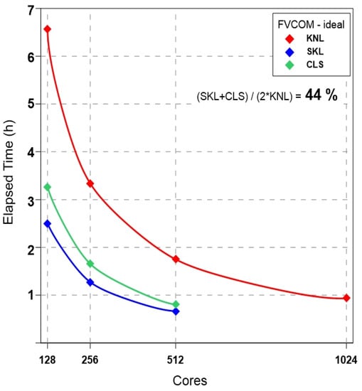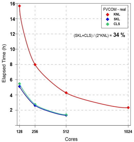 The results of each experiment are summarized in Figure 19. The KNL system performed at an overall rate of approximately 34% compared to the performances SKL and CLS. This is slightly slower than the benchmark experiment of FVCOM (44%) due to the loads of I/O accessing. The calculation amounts were different between cores because of the different I/O loads. The performances of FVCOM in the CLS and SKL systems were almost the same, unlike those of WRF and ROMS (see the green and blue lines in Figure 20). This is due to the evenly distributed I/O loads per computed node characterizing the unstructured grid model. This dynamic continuously increased the parallel performance of the KNL system.