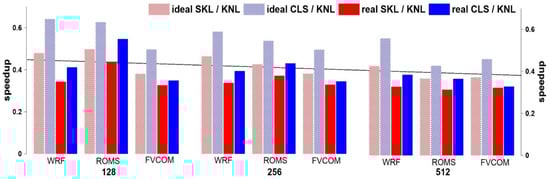 WRF, ROMS, and FVCOM were tested for optimization by core configuration, MPI libraries, various compiler options, memory modes and so on. In conclusion, the best approach is to compile with only the “xMIC-AVX512” compilation option in the cache memory mode. All 32 cores were used for the real experiments of ROMS and FVCOM because a large access of I/O caused out of memory. The performances of the real experiments were lower than those of the ideal experiments because the distributions of the calculated amounts are different between cores due to the differing I/O loads. Performances were compared between the SKL and the CLS systems based on the KNL system (Figure 20). When the same numbers of cores were used, the average performance of the KNL system was about 43% (highest: 64%, lowest: 31%) of SKL or CLS (128 cores: 46%, 256 cores: 43%, 512 cores: 39%).