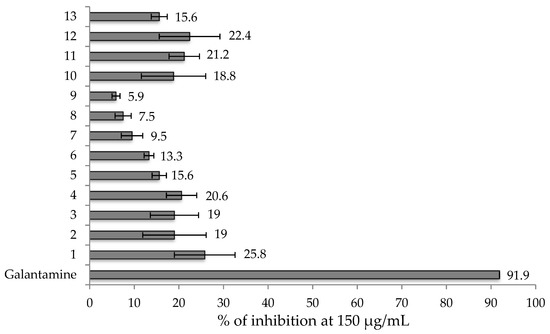Percentage of acetylcholinesterase inhibition of triphenyl imidazole compounds 1–13 (150 μg/mL). Galantamine served as the reference compound.