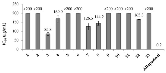 Xantine oxidase inhibitory activity of synthesized compounds 1–13. Allopurinol served as the reference compound. Bars are mean ± SD, n = 3.