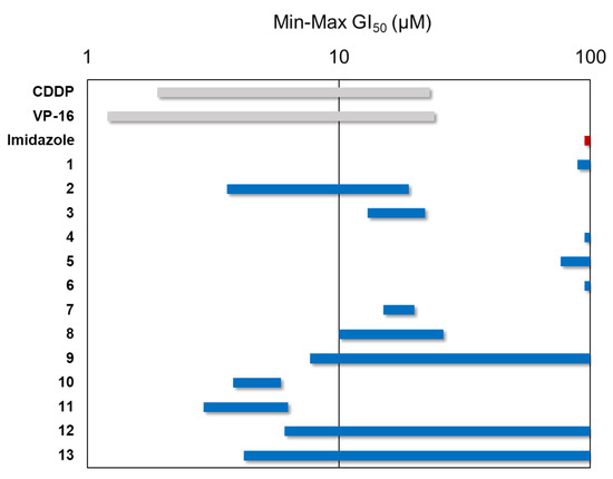 The obtained results from the evaluation of the 13 synthesized compounds with the SRB assay against the tumor cell lines (Table 2) showed no selectivity by any specific line. Based on the results in Table 2 and the GI50 range (Figure 3), the most active compounds of the series were 10 and 11. As initial highlights, imidazole had no inhibitory activity in the compounds employed as controls; on the other hand, one of the most resistant cell lines against the synthesized compounds and drugs was A549, which corresponds to lung adenocarcinoma, and this is in agreement with the literature, as it has been documented that lung type cancers are usually chemotherapy resistant, even to one of the most used antitumor drugs, taxol [43].
