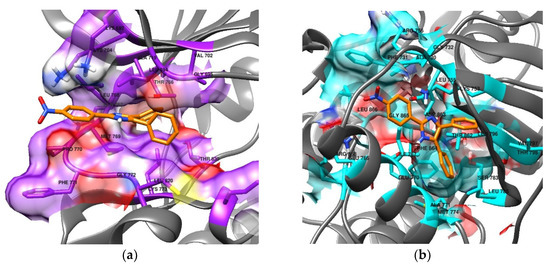 Compound 11 (orange) depicted with both of the analyzed receptors. Highlighted are the residues at distances <5.0 Å from 11, with some surfaces active to show the cavity in which the docking analysis put the best docked pose. (a) EGFR, with the near residues in purple. (b) HER2, with the near residues in cyan.
