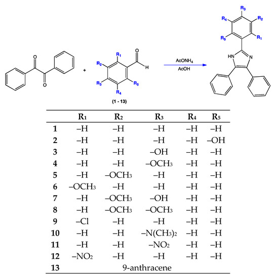 A mixture of ammonium acetate (5 Eq) and acetic acid (10 mL) were refluxed; after five minutes of constant dripping, 1 Eq of the appropriate aldehyde (1–13) was added; finally after another five minutes, 1 Eq of benzil was added. Reflux was continued until completion of the reaction (verified by Thin-layer chromatography). To stop the reaction, ammonium hydroxide was added up to a pH of 9, the formed precipitate was filtered, washed using cold water, and dried. To purify the product, column chromatography or recrystallization was employed. Confirmation of all structures were achieved by mass and NMR spectra, as discussed below: