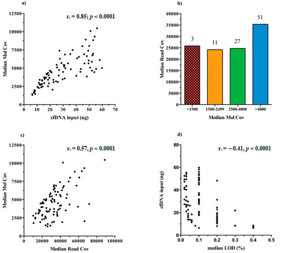 Bearing in mind what is reported by manufacturer to reach the main goal of a 0.1% LoD, we showed a fulfillment of the median value of molecular families (MedMolCov >2500) and the median values of read coverage (MedReadCov >25,000) in more than half of sequenced samples (60.9%). Not surprisingly, a strong correlation between the cfDNA input and MedMolCov was found, since it is expected that the more cfDNA that is introduced for NGS libraries, the higher will be the number of molecular families sequenced, as already reported [