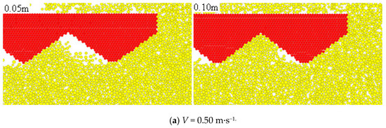 Figure 8 shows the dynamic velocity fields of the interactions between the pangolin scales and abrasive sand under different velocities. The direction and the length of the arrows represent the direction and the size of the velocity. The velocity field reflects the velocity change for each element at any time. With the pangolin scale moving forward, some particles of abrasive sand are propelled forward, and some others are forced to move up or down due to the resistance of the frontal sand abrasives. The vortex flow of the abrasive sand caused by the moving scale emerges near the scale tip [14]. Correspondingly, due to the abrasive resistance, the element velocity of the scales seems to undergo a nonuniform change. With the velocity increasing, the kinetic energy of the pangolin scale increases greatly. The larger kinetic energy intensifies the motion state of the abrasive sand near the pangolin scale surface, the change frequency of the sand displacement increases and the change range expands. In Figure 8, the nonuniform velocities of the scales, which are caused by the contact force acting on the scales, are shown.
