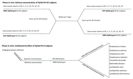 The research protocol was conducted in two phases (Figure 1). In the first, an in vivo double-blind cross-over study was performed to measure the salivary concentration of xylitol released from two types of chewing gum containing different amounts of the polyol. The study had a cross-over design: the first half of the sample used the chewing gum with xylitol as the only sweetener (100% xylitol chewing gum) and the other half used the chewing gum with xylitol among the sweeteners (22% xylitol chewing gum); after a 7-day wash-out period, the two sub-groups reversed the types of chewing gum. Subjects were instructed to consume the products as they normally do. Throughout the study the subjects were not allowed to use mouthwashes, other xylitol products, antimicrobial medications, etc. In the second phase of the designed protocol, the antibacterial efficacy of the two types of chewing gum was tested in vitro against nine different strains of oral bacteria.