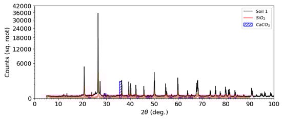 To provide direct evidence that MICP can be induced in these soils, precipitation experiments were conducted using bacteria stimulated with urea and 1.0 g/L yeast extract concentrations. Aliquots of bacteria stimulated from soils for seven days were spiked into fresh urea, and yeast extract-containing media were supplemented with CaCl2. Within two days, the media became turbid, and white precipitates appeared at the bottom of the Erlenmeyer flasks (data not shown). Urea hydrolysis was confirmed in samples provided with stimulated bacteria from either soil, albeit higher rates were observed in soil 2 than in soil 1 (Figure 4). This effect probably resulted from differences in biostimulation rates between the two soils (Figure 3). After two weeks of incubation, precipitates were collected, dried, and identified by XRD as calcite (Figure 5). Neither precipitation nor urea hydrolysis took place in negative control samples (AGW) incubated in the same conditions.