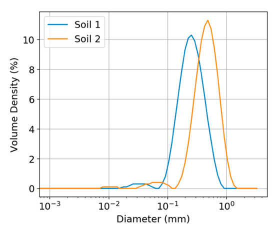 Soils were collected from two sites of the Rotem Plateau at the northern Negev Desert in Israel, a broad plateau covered with clastic sediments of the Miocene Hazeva Fm. Soils are mainly composed of quartz and calcite, as shown by XRD analyses (Figure 1). XRF analyses showed that the two soils are similar in their elemental composition; however, significantly higher levels of Si and lower levels of Ca were identified in soil 1 than soil 2 (Table 1). Particle size distribution analysis showed that the soils are classified as sand (Figure 2 and Table 2), with soil 2 showing a higher coarse sand fraction 94%, compared to 64% in soil 1, and a lower fine sand fraction, 6% and 36% in soil 2 and soil 1, respectively.