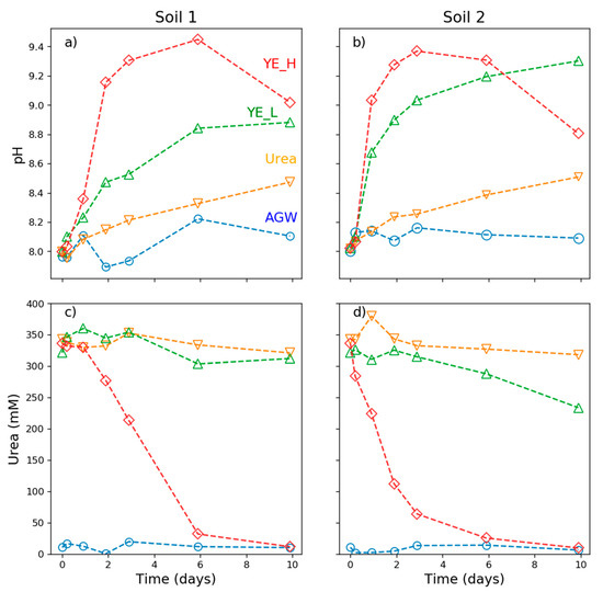 Biostimulation of soils from the stimulated soils from the Rotem Plateau. (a) pH of soil 1; (b) pH of soil 2; (c) urea concentration of soil 1 and (d) urea concentration of soil 2. AGW is artificial ground water (o); urea is urea control (∇); YE_L is low (0.1 g/L) yeast extract enriched medium (Δ); YE_H is high (1.0 g/L) yeast extract enriched medium (◊).