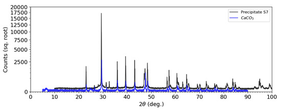 XRD patterns of precipitates produced by biostimulated soil (1) bacteria grown in CaCl2 precipitation media. Counts in arbitrary units. CaCO3 is calcite reference RRUFF R040070.