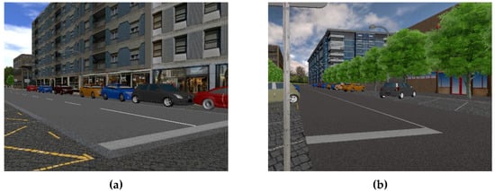 Two existing real-world streets were modeled in two different virtual scenarios: Rua 25 de Abril, in Braga, and Rua Teixeira de Pascoais, in Guimarães. Each one followed a similar development process. First, dimension and distance measurements were taken from the streets, including the length and width of the crosswalks and its markings, the road width, the width of the sidewalks, the length and width of the parking sites, and the sizes of the road. Afterward, the two scenarios were modeled in Blender 2.79a, an open-source 3D computer graphics software that uses Python as a scripting language. Several architectural details such as buildings, vertical signalization, and vegetation were modeled, and textures from pavements and buildings were added to provide participants with a more realistic depiction of the roads (Figure 1a,b).