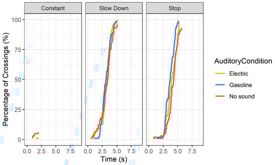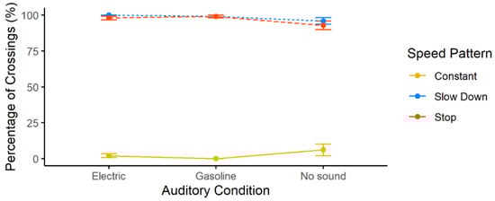 A significant auditory condition × speed pattern interaction on participants’ percentage of crossings was also found, F(4, 36) = 2.89, p = 0.04, η2 = 0.24. However, considering the results shown in Figure 3, the effect of this interaction was mainly due to the great relevance of the speed pattern effect on the percentage of crossings and not exactly to that regarding the interaction between the two variables, as shown by the small effect size value (η2). Bonferroni post-hoc test indicated the percentage of crossings is only significantly different when the auditory conditions at constant speed (electric: m = 2.00%; sd = 4.22%; gasoline: m = 0%; sd = 0%; no sound: m = 6.00%; sd = 12.65%), slow down (electric: m = 100.00%; sd = 0%; gasoline: m = 99.00%; sd = 3.16%; no sound: m = 96.00%; sd = 6.99%), and stop (electric: m = 98.00%; sd = 4.22%; gasoline: m = 99.00%; sd = 3.16%; no sound: m = 93.00%; sd = 9.49%) patterns were compared. No significant differences existed between the percentage of crossings referring to the different auditory conditions verified for the stop and the slow down patterns.