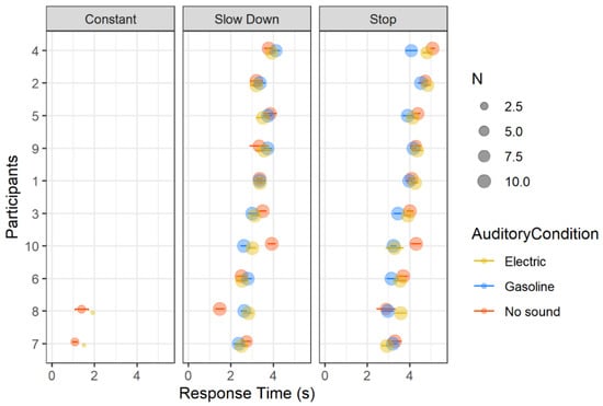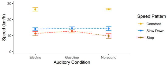 Regarding the vehicle speed at the moment of the participants’ response, Figure 8 shows a great similarity between the three auditory conditions. However, in the results of the stop pattern stimuli, the participants crossed with higher vehicle approaching speeds when they were presented with the sound of a gasoline combustion vehicle. The model results show that in fact the vehicle speed at the moment of response was significantly higher for gasoline stimuli (m = 13.72 km/h; sd = 4.92 km/h; p = 0.02) than for electric stimuli (m = 12.85 km/h; sd = 5.51 km/h). Non-significant differences were found between the speeds of the no sound (m = 12.47 km/h; sd = 6.34 km/h; p = 0.13) and electric condition.