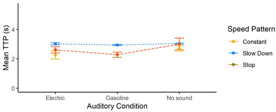 The values of TTP were very similar across conditions. Nevertheless, a slightly lower value of TTP for the stop and constant speed conditions was noticeable when compared with the slow down condition. Regarding the type of auditory condition, lower values of TTP were found when the gasoline vehicle approached than in the others. The highest values of TTP were found in no sound condition (Figure 6).