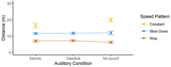Two Linear Mixed Models were developed to assess the influence of the auditory condition on the distance at which the vehicle was and the speed it was going at the moment the participants decided to cross. The analysis in Figure 7 shows that these distances were very similar in all auditory conditions, considering each speed pattern separately. The results of the model show that the recorded distances at the moment of response did not differ in the no sound condition (m = 9.45 m; sd = 4.98 m; p = 0.70) or in the gasoline condition (m = 9.50 m; sd = 3.54 m; p = 0.39) when compared with those registered when approaching the electric vehicle (m = 9.37 m; sd = 4.12 m).