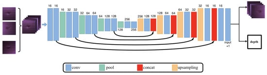 The architecture of the proposed network is shown in Figure 1. The U-shaped network structure could fully combine the simple features of shallow layer in the decoder stage, so it could also adapt to our small dataset. Our network contained twenty-nine layers, including twenty-one convolution layers, four pooling layers and four up-sampling layers. The activation function of all the convolution operations in the network was ReLU, and we took multiple RGB images from different light source directions containing different degrees of shadow and brightness information as the input of the network. In addition, the network outputted the original RGB images synthesized by the proposed network while outputting the predicted depth—that is, the output of the network was a multi-channel output.