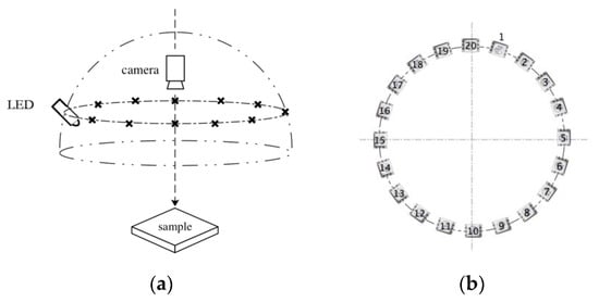 We set up a real photometric stereo experiment platform to collect the images needed for training, as shown in Figure 3a. The camera and the circular light frame were fixed by a frame including clamping devices to ensure that the light conditions of each acquisition were determined and consistent, and the light frame was fixed with the camera (Automation Technology GmbH, Bad Oldesloe, Germany) at its center. The arrangement of the circular light frame is shown in Figure 3b. We designed our light sources as 20 white LED bulbs of the same size (60 degrees) as the scattering angle and fixed them on a circular ring. The angle interval between each adjacent white LED bulb was 18 degrees.
