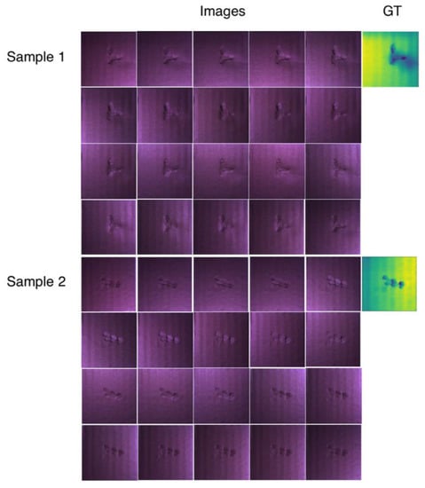 Through the program control, we lit up the LED bulbs in each direction in order and collected 2000 images corresponding to 100 samples in turn, all of which were captured in the dark room. We used 95 samples as the training set and the remaining 5 as the test set. The collected samples were cropped and then resized to the pixel size of 256256, which was convenient for network training and better fitting function. We also obtained the GT of each object by line structured light scanning and accurately registered them on the two-dimensional images we collected, as shown in Figure 4.