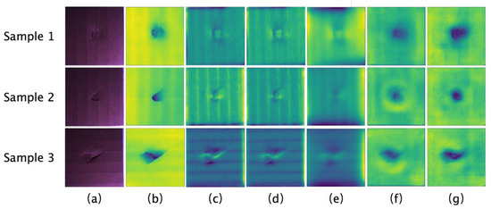 In order to verify the practical significance of the neural network used to learn Photometric Stereo for 3D reconstruction, we compared the results of the classic multi-source Photometric Stereo method (BASELINE) and ours with GT to conduct a qualitative analysis. We reconstructed the target surface with the BASELINE method using 5, 10 and 20 two-dimensional images taken under the illumination of light sources with equal angle intervals, as shown in Figure 5c–e. The BASELINE method had an obvious effect on the reconstruction of the corrugates which excessive smoothly, but the cast shadow and attached shadow caused by the fracture led to an anomaly in the 3D information extraction at the deeper fractures (Sample 3). However, there was a smooth transition in ours at the fracture site, which made our prediction more reasonable. For the defect surface with more small cracks, ours could not reproduce all the details perfectly. In comparison, the BASELINE results lost more surface information, and the smooth inclined position with little feature information could not present a reasonable three-dimensional shape. In addition, because the surface features of the target samples did not conform to the standard Lambert model, the reflection around the defect resulted in different degrees of bulge in the transition from the plane to the defect in the reconstruction surface of the BASELINE method (Sample 2). Our method took GT as the direct optimization goal, which could minimize the influence of the highlights in the input on the correct prediction results.