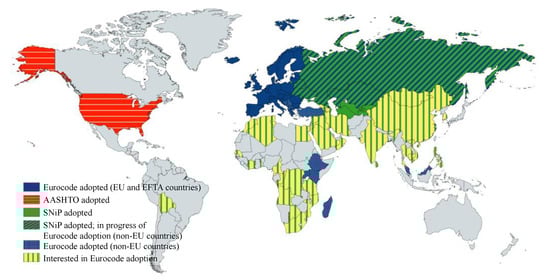 In recent years, Kazakhstan has been experiencing a rapid urbanization supported by solid economic growth and strong political engagement in modernization programs []. The stable economic progress of Kazakhstan over the years of independence has contributed to the continuous development of the construction industry in the country, making the construction sector one of the driving forces in the country’s economy. The government pays particular attention to the realization of large-scale, high-priced projects, therefore encouraging foreign investors to implement international projects in Kazakhstan []. The construction of buildings and structures based on international codes of practice (e.g., Eurocode and American Association of State Highway Transportation Officials (AASHTO)) experiences some difficulties associated with the adaptation of project documentation to the local regulation system due to the differences in the applied design methods.