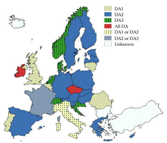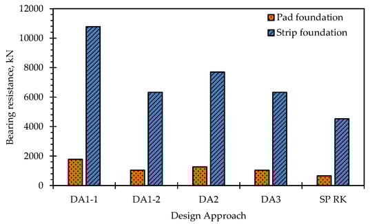 The distribution of the design approaches applied in EU countries for the design of shallow foundations is provided in Figure 2. The application of different design approaches in EU countries is associated with the difference in the safety levels of buildings and structures, which are set by each country by considering different regulatory systems, design traditions, and environmental conditions []. The recommended values of partial factors for all design approaches are presented in Table 2.