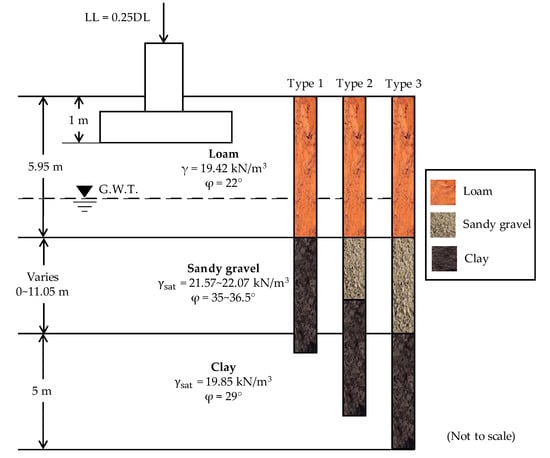 The bearing capacity and the elastic settlement were determined for two types of shallow foundations (i.e., strip foundations with B = 2 m and L = 10 m and pad foundations with B = 1.5 m and L = 2 m). The foundation depth is considered to be 1 m below the ground surface for both design cases. The ground water level is assumed to be located 2 m below the existing ground surface []. The given load condition requires the variable load to be 0.25 times that of the permanent load (). The simplified analysis does not consider tilt or rotation over the foundation base.