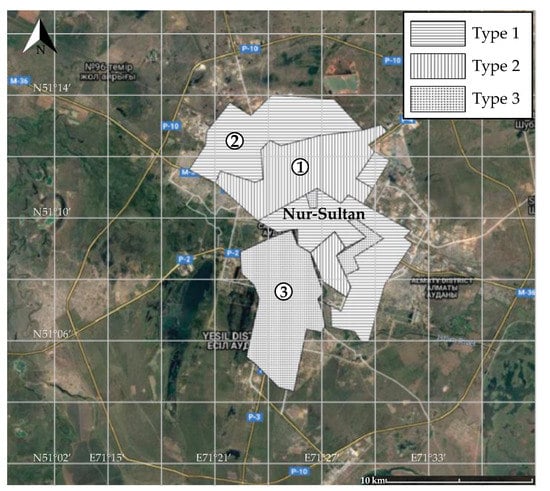 With reference to the site investigation data obtained from Alibekova and Zhussupbekov [], the soil profiles and soil properties for Nur-Sultan were studied. Based on the analysis of soil properties performed at the construction sites, the whole city territory was divided into uniform zones using “Geographic information database” software. The soil profile of Nur-Sultan mainly consists of three layers, including loam, sandy gravel, and clay, with the depth varying depending on the soil profile type (Figure 3). The zoning of three different types of Nur-Sultan soil profiles is provided on the map (Figure 4). Table 3 summarizes the soil properties for Nur-Sultan city used in this study.
