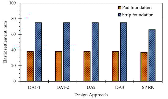 The divergence between the elastic settlement values is achieved by the application of different design methods and the determination of the vertical pressure acting on the foundation base. In particular, EC 7 estimates the settlement of shallow foundations using the adjusted elasticity theory, whereas Kazakhstani regulations use the method of layer summation. In addition, the obtained results of bearing capacity and elastic settlement for strip foundations indicate higher values than for pad foundations. The performed calculations for all types of soil profiles of Nur-Sultan city resulted in similar values for both the bearing capacity and elastic settlement of shallow foundations. However, the elastic settlement for strip foundations varied in the range of 66–69 mm when adhering to the Kazakhstani approach.