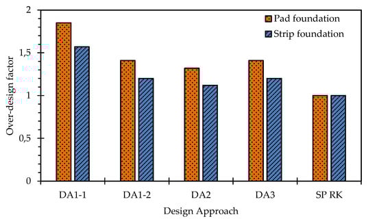 To compare the considered codes of practice in terms of design conservativeness for pad and strip foundations, the values of over-design factor (ODF) must be obtained. ODF, representing the degree of safety of the structural system, can be calculated by using the following equation []: