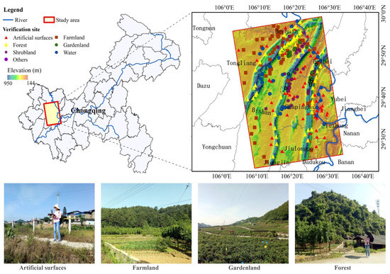 Supplemented by the vegetation community survey method, we conducted field surveys in May 2017. The route was laid according to the terrain and land cover types in the study area. The plots were mainly set up to have a more uniform spatial distribution of features and regional heterogeneity. In the survey, one to three samples of 5 m × 5 m are selected at uniform locations of land cover with intervals of 5 to 10 km. The hand-held GPS is used to record the latitude and longitude coordinates, elevation, land cover type, and surface features. After removing some abnormalities from the sample points, a total of 284 survey samples were recorded. As a typical ecologically fragile area, Chongqing has complicated topography and landforms, various land cover types, and covers most of the Three Gorges Reservoir, highlighting its important ecological geographical location, so it is important to study the land cover classification of this area.