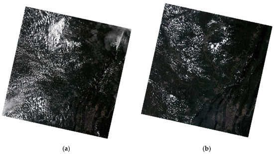Different cloud-cover Landsat OLI data. (a) Cloudiness: 26.28%; (b) Cloudiness: 8.43%.