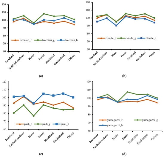 Comparative analysis of eigenvalues was performed using the Pauli, Cloude–Pottier, Freeman–Durden, and Yamaguchi decomposition methods [24,25,26,27,28,29], obvious differences were observed in the characteristics of various types of objects (Figure 4). The x-axis represents different land cover types in the image, the y-axis represents the eigenvalues after polarization decomposition, and r, g, and b represent the eigenvalues of the RGB spectral bands after polarization decomposition, respectively. Among these, after the decomposition using the Pauli method, the eigenvalues of the various types were observed to be significantly different from one another, which is conducive to better distinguish the types of objects. The RGB bands of Pauli decomposion correspond to three physical scattering mechanisms (i.e., odd-scattering, even-scattering, and volume scattering mechanisms) and can be used to qualitatively analyze the physical significance of the land covers in the polarimetric SAR image. The subsequent processing of ALOS 2 data is based on the results of the Pauli decomposition.