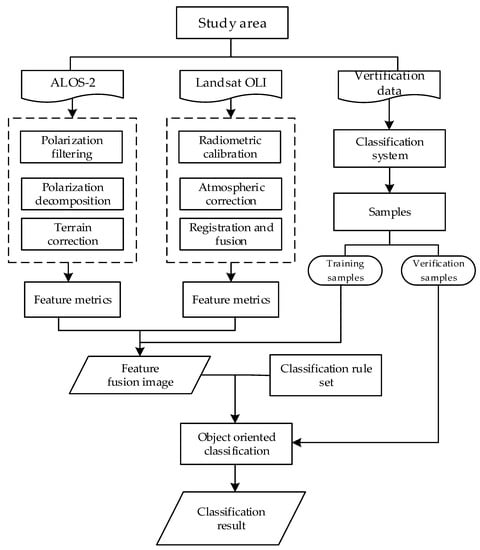 In this section, the methods for LULC classification based on fusion feature image are described in detail. Firstly, the features were extracted from Landsat 8 OLI and ALOS 2 SAR satellite images, and redundancy was removed from high-dimensional features. Then, we retained the features with low correlation and eliminated other redundant features. Features level fusion was conducted based on a certain weight. An adaptive multi-scale segmentation model was used to create image objects and optimize the scale parameters, and then an improved SVM classifier was used to conduct LULC classification experiments in the study area. The concept of the novel feature-level fusion framework and the detailed features processing is demonstrated in Section 3.1. Section 3.2 describes the basic concept of several classification system and LULC categories selected in this article. To the conduct experiment and assess the performance of the applied methods, the improved SVM classifier and its characters are described in Section 3.3.