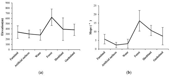Elevation and slope of various land-cover types. (a) Elevation; (b) Slope.