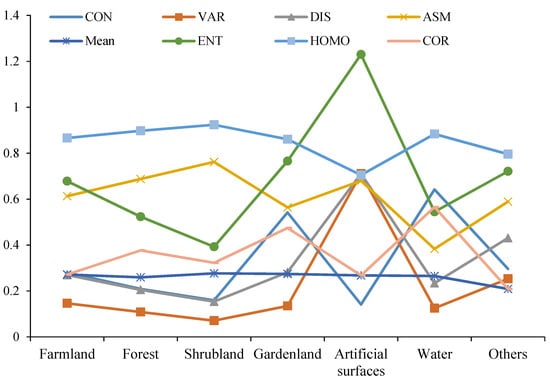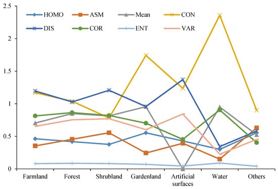 The texture features of different land-cover types based on the Landsat OLI data were compared with one another, the features include contrast, homogeneity, angular second moment, entropy, mean, dissimilarity, variance, and correlation. We selected the texture features of 100 land-cover samples. As depicted in Figure 8, Figure 9 and Figure 10, the texture features of different types were considerably different from one another. In addition, using comparative analysis, it was observed that contrast, which is an entropy (ENT) feature, was significantly different for each type, and that it was easy to extract the LCC information using the contrast feature. We selected these features to participate in the subsequent classification.