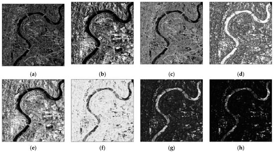 Texture features of ALOS-2. (a) Contrast; (b) variance; (c) dissimilarity; (d) angular second moment; (e) mean; (f) entropy; (g) homogeneity; (h) correlation.