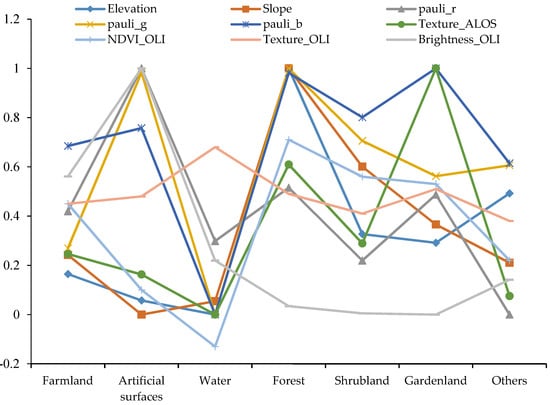 PCA was used to fuse the spectral, texture features of OLI images and texture features of ALOS 2 images (Figure 11).