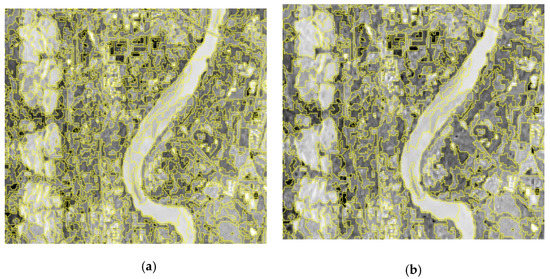 For Landsat OLI and ALOS-2 features fusion data, multi-scale segmentation was still used in this study. The weights of the three bands after segmentation and fusion were set to 1; the shape coefficient was 0.1 and the compactness 0.5. I tried three scales of 5, 15, 20, and 30. Through comparison and discrimination with the naked eye, the scales were over segmented at 5, and the scales of 20 and 30 could not represent the best contours of the features. In addition, the image-segmentation scale was set to 15, which can satisfactorily maintain the boundary of the features, as depicted in Figure 12.