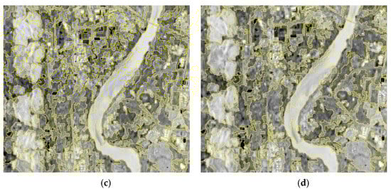 Different scale-segmentation effects based on features fusion image. (a) Scales 15; (b) scales 25; (c) scales 35; (d) scales 50.