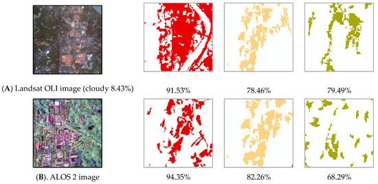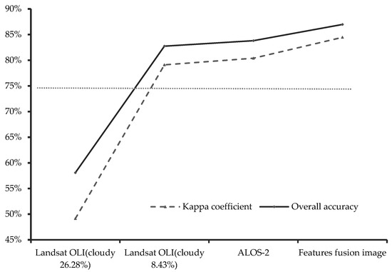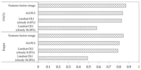The overall classification accuracies of the Landsat OLI data, ALOS-2 data, and the post-fusion data were mainly measured using the overall classification accuracy (overall’s accuracy) and Kappa coefficient (Table 4). The classification accuracy of several types of data is depicted in Figure 15. The Landsat OLI data (cloudiness 26.28%) have the lowest overall classification accuracy, with the total accuracy of 58.09% and a Kappa coefficient of 0.4913. The overall classification accuracy of the Landsat OLI data (cloudiness 8.43%) is comparable to that of the ALOS-2 data, with the total accuracy of approximately 83% The Kappa coefficient is approximately 0.8; the overall classification accuracy of the Landsat OLI and ALOS-2 data is the highest, with the total accuracy of 86.97% and the Kappa coefficient of 0.8447. The fused data contains both the spectral information of the optical data and the polarization decomposition characteristics of the fully polarized SAR data. It has strong information complementarity. Compared with the Landsat OLI image or ALOS-2 image alone, the overall accuracy is improved by about 4%.