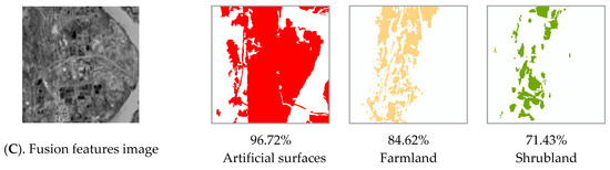 On the basis of the above, this study attempts to design an improved SVM method to classify fused images. By continuously selecting and optimizing the training samples, taking this sample as the center, continuously adjusting the core parameters in the SVM model, and after many experiments, the classification results were obtained, as depicted in Figure 13. The classification accuracy of each feature type is mainly measured by user accuracy (UA) and producer accuracy (PA). UA refers to any random sample from the classification result, which has the same conditional probability as the actual type on the ground, PA refers to the classifier’s ratio of the sampled pixels of the image correctly classified into the category A to the total number of the samples classified into the category A. As can be seen from the enlarged view of land types, artificial surfaces, farmland, forest, shrubland, water are better distinguished, producer accuracy (PA) and user accuracy (UA) are relatively high, which meets the classification needs of mountain land cover types. Figure 14 shows the comparison of classification results, A is the classification of Landsat OLI image (cloudines 8.43%), B is classification of ALOS 2 image, C is classification of Fusion features image, compared with the classification results and accuracy of A and B, the classification results and accuracy of C are greatly improved excluding the shrubland class. This is because the hierarchical structure of shrubland is not as regular as forest, and texture features of shrubland vary greatly in large scale regions. The accuracy of shrubland based on OLI image is higher compared with ALOS-2 image and fusion feature datasets. Table 3 shows the accuracy validation of land-cover type classification results based on fusion image.