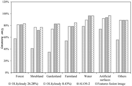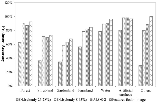 The specific classification accuracy of each locality type (forest, shrubland, gardenland, farmland, water, artificial surfaces and others) is shown in Figure 15, Figure 16 and Figure 17. In terms of three types of data, the feature fusion data has higher extraction accuracy for forest, shrubland, gardenland, farmland, water and artificial surfaces, especially in extracting forest and farmland. Landsat OLI data (cloudiness 8.43%) only has higher extraction accuracy for shrubland, ALOS-2 data has higher extraction accuracy for artificial surfaces and forest. The experimental data has lower accuracy in producer accuracy of shrubland and gardenland, indicating that these two types are most likely to be misclassified, forest and farmland are less likely to be misclassified. From the overall classification accuracy, it can be seen that, for the same Landsat OLI data, different cloud covers have a great impact on the classification accuracy of land cover. When the cloud cover is 8.43%, the OA is about 82.75%, and the Kappa coefficient is 0.791, which basically meets the general feature extraction requirements. When the cloud cover is 26.28%, the OA is 58.10%, and the Kappa coefficient is only 0.4913, under this situation the accuracy is low and cannot be used for basic feature type extraction, and it is difficult to identify the LULC types with more mixed pixels or objects. Figure 16, Figure 17, and as expected—the improved SVM method—is found as best suited for forest and shrubland features classification, accuracy of both UA and PA got increased. Accuracy of forest areas was improved, and this was reflected by the intensity values present in the microwave span image which contributed to the fused features image.