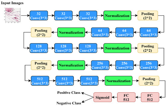 The proposed CNN was chosen by analyzing the extant literature in the area, thus exploiting the contributions of different works. The main inspiration of the proposed model is the VGG16 architecture [26], with the main differences being (1) the use of normalization layer in every convolution block, (2) the use of three convolution layers in every block instead of four, and (3) the use of fully connected layers with 512 neurons instead of 4096. The proposed architecture is shown in Figure 1. In the proposed architecture, the input image size is 96 × 96 pixels. The architecture has 5 convolution blocks that act as feature extractors and one fully-connected block that acts as a classifier. In the first convolution block, three convolution layers followed by a batch normalization layer and a max-pooling layer are used. The padding is kept the same for the three convolution layers to make use of every pixel, especially in the first convolution block and, for the same reason, the stride is set to 1. For the three convolution layers, 32 kernels were used with a size of 3 × 3. To reduce the dimensions by two to keep the most relevant features obtained from the first convolution block, a max-pooling layer is added. The second, third, and fourth convolution blocks use the same hyperparameters used in the first convolution block, except for the number of kernels used, which was set to 64, 128, and 256, respectively. In the fifth convolution block, the second and the third convolution layers have no padding to decrease the spatial information with 512 kernels. The output of the convolution blocks is flattened and, subsequently, it becomes the input of the classifier block. The classifier block has two fully connected layers, each with 512 neurons. Overall, the inputs to the convolution blocks are 96 × 96 × 3, 48 × 48 × 32, 24 × 24 × 64, 12 × 12 × 128, and 6 × 6 × 256, respectively. The final layer is a sigmoid function that is used to classify into two classes. In total, the proposed architecture consists of 15 convolution layers, 2 fully connected layers, 5 pooling layers, and 5 normalization layers.