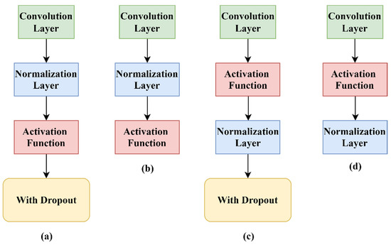Different designs tested: (a) shows the first design, the proposed architecture with the normalization layer placed before the activation function, and two dropout layers are placed in the classifier block; (b) shows the second design, which is similar to the first design but without any dropout layers; (c) shows the third design, where the normalization layers are placed after the activation function, and two dropout layers are placed in the classifier block; and (d) shows the fourth design, which is similar to the third design but without any dropout layers.