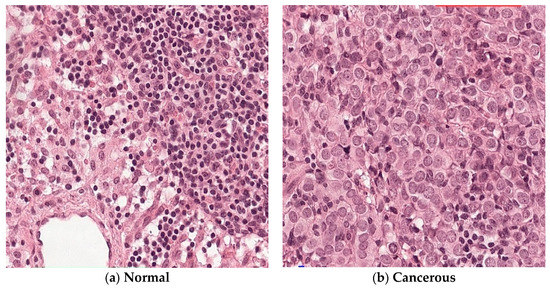 The PatchCamelyon dataset [17,18] is an extension of the Camelyon dataset, which contains 277,000 histopathology images with an image size of 96 × 96 pixels at 10× magnification. A total of 220,000 images are annotated with 60% positive cases and 40% negative cases. A total of 57,000 images are un-annotated images to test the classifier, and there are no duplicates in the PatchCamelyon dataset. The resulting model is subsequently used to predict the labels of the test set and finally uploaded to the Kaggle platform to obtain the model AUC. This process was necessary since the test labels are available only to the owner of the data. To increase the size of the dataset and to make the model more robust to overfitting, the following augmentation techniques were applied: horizontal flip, vertical flip, rotation range, zoom range, width shift range, height shift range, shear range, and channel shift range. Figure 3 shows two images of the considered dataset.