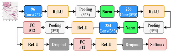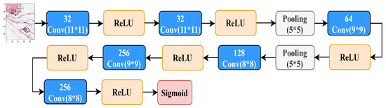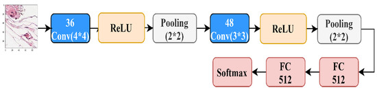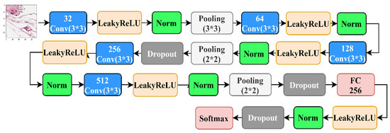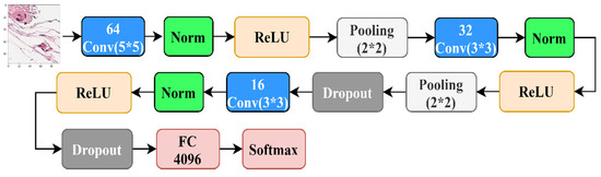 The architecture of Bayramoglu et al. [21] has three convolution layers and two fully connected layers. The authors placed the normalization layer after the activation layer and after the pooling layer as well. The results of Adam and RMSProp optimizers are significantly different, with Adam being the best optimizer. Compared to our design, this architecture has low capacity, since it has only three convolution layers. The difference between the performance of our proposed architecture and the architecture proposed by Bayramoglu et al. [21] can be explained (beyond the number of convolution layers) considering the usage of a larger kernel size in the first convolution layer. This is something that could be detrimental to the performance of the network. Using smaller kernel sizes allows the network to learn complex, more non-linear features. The architecture of Bayramoglu’s [21] is shown in Figure 8.